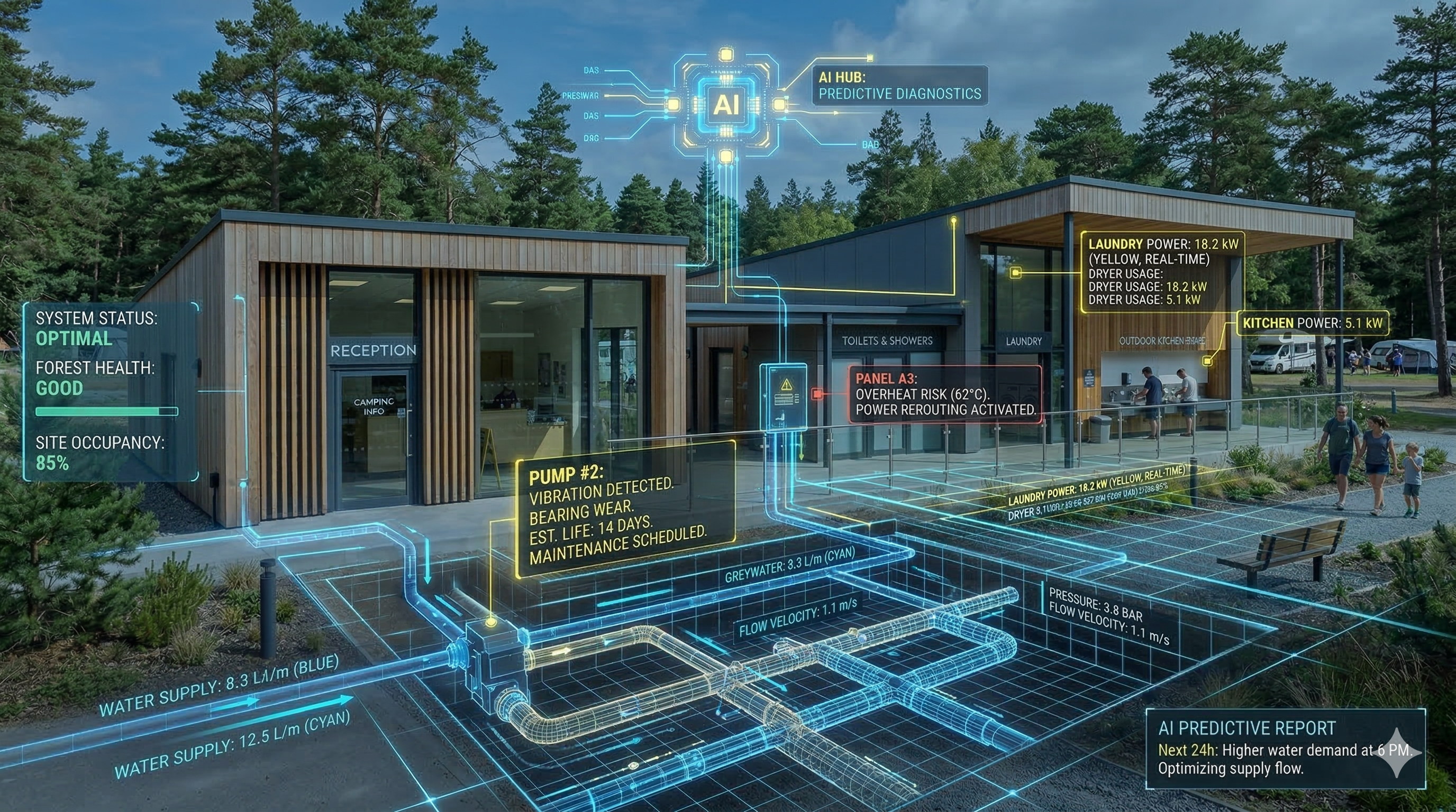 Integramos sensores IoT y algoritmos de IA para monitorizar el consumo hídrico y eléctrico. El sistema detecta fugas de agua en segundos, evitando pérdidas económicas y daños en el terreno.