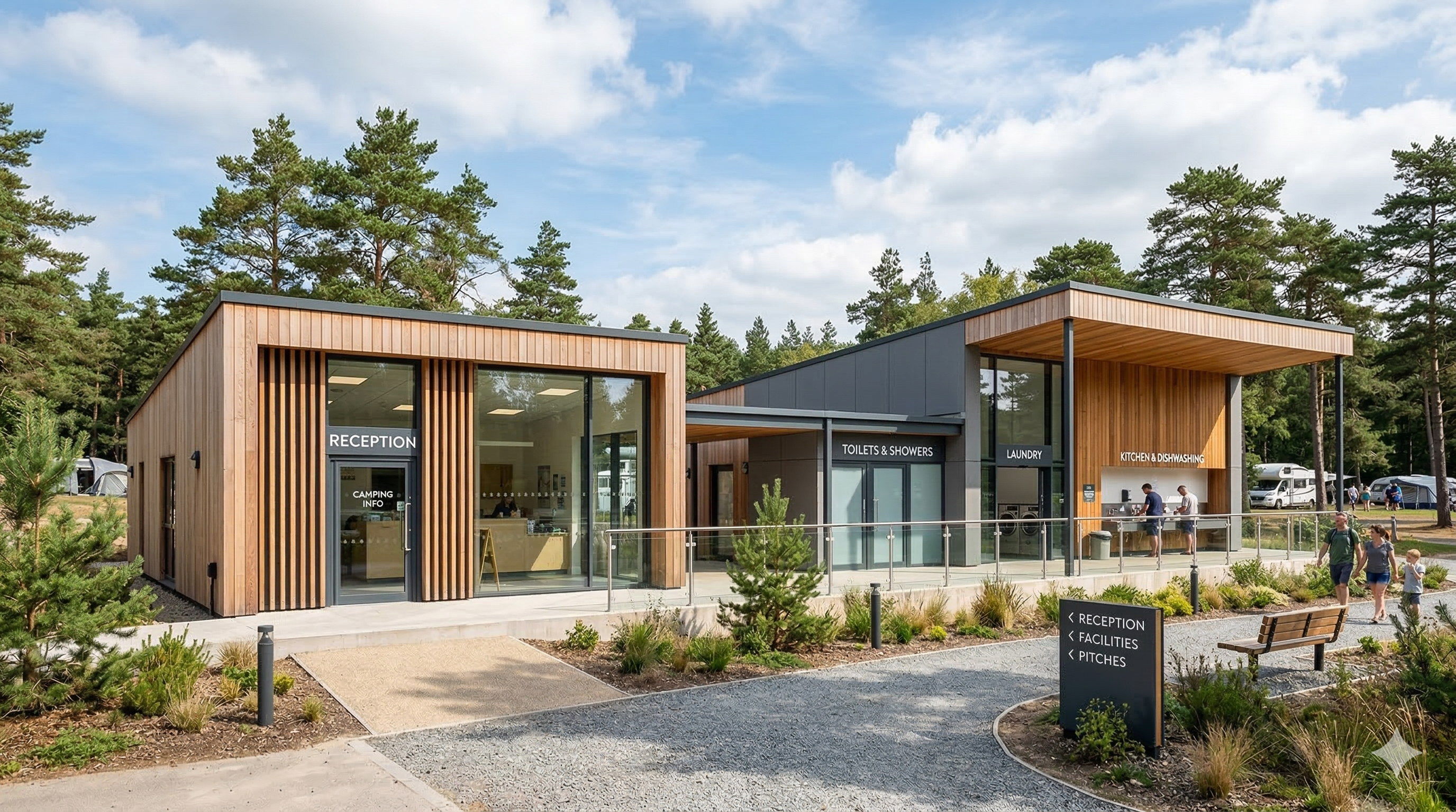 Bloques sanitarios y bungalows con arquitectura moderna.