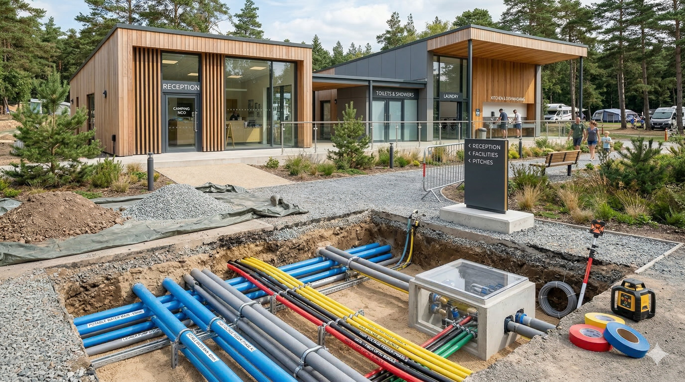 Ejecutamos redes enterradas de alta complejidad. Sistemas de saneamiento por vacío o gravedad, y redes eléctricas preparadas para la carga simultánea de múltiples vehículos eléctricos y caravanas de alto consumo.