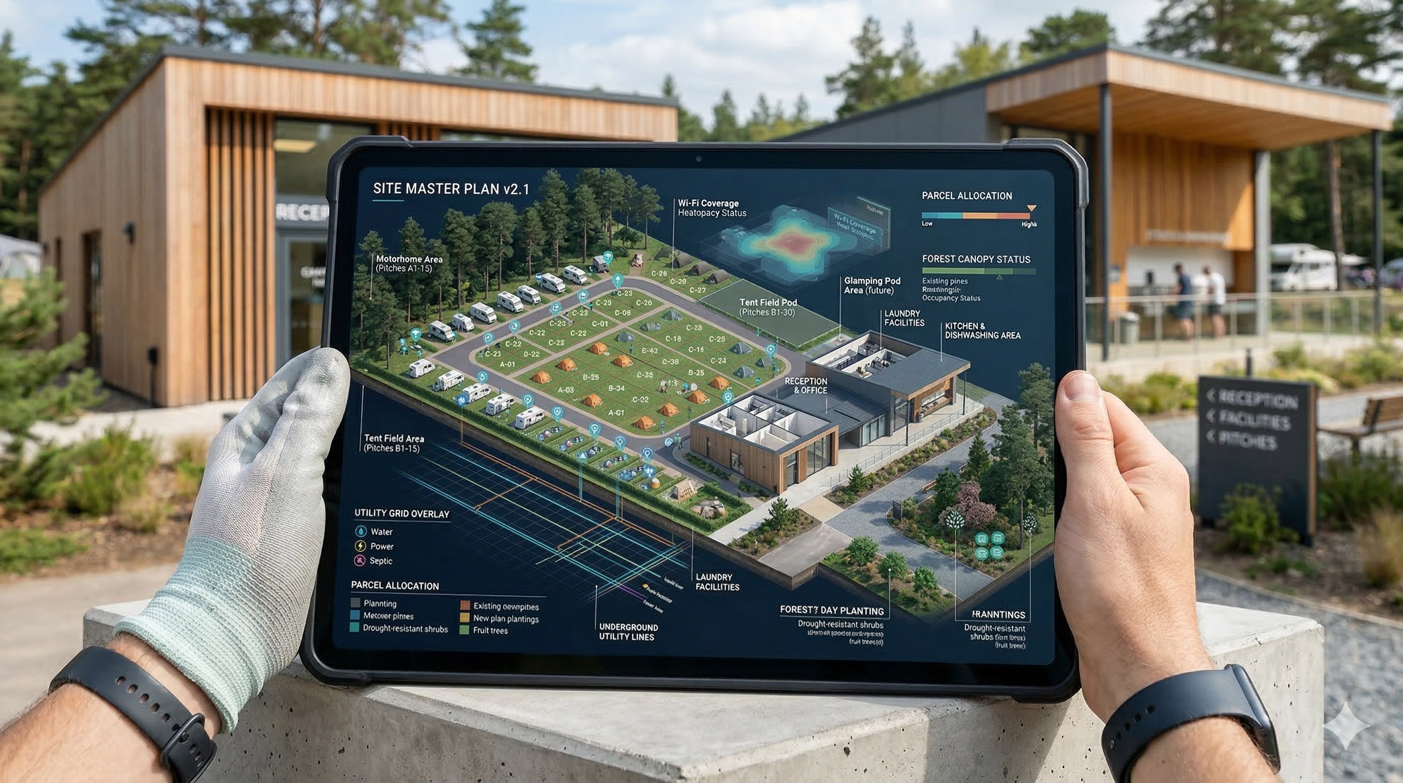 El layout de un camping es vital. Analizamos la topografía para crear parcelas de diferentes tamaños, viales de circulación fluida y zonas comunes estratégicamente ubicadas.